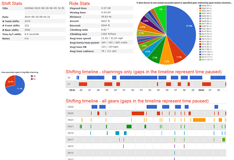 Click the image below to see the current data available. New statistics visualizations will be added soon -- including "per gear" power/cadence/speed/etc... That information is currently available in the raw data section at the bottom of the analysis page. If you like what you see, please create an account (free!) and enjoy! By creating an account and using this website, you agree to have your data anonymously used in a research study on gear shifting. Thanks!